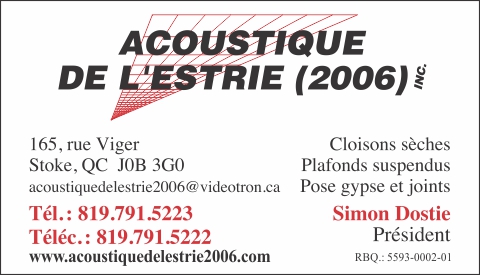 Quels que soient vos projets ou besoins en terme de produits et services, vous trouverez en ACOUSTIQUE DE L'ESTRIE (2006) INC un partenaire de confiance reconnu pour son approche professionnelle et son efficacité. Nous sommes des experts en Systèmes Intérieurs (Gypse Pose), .
